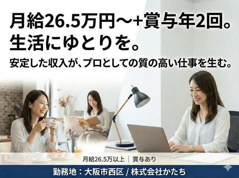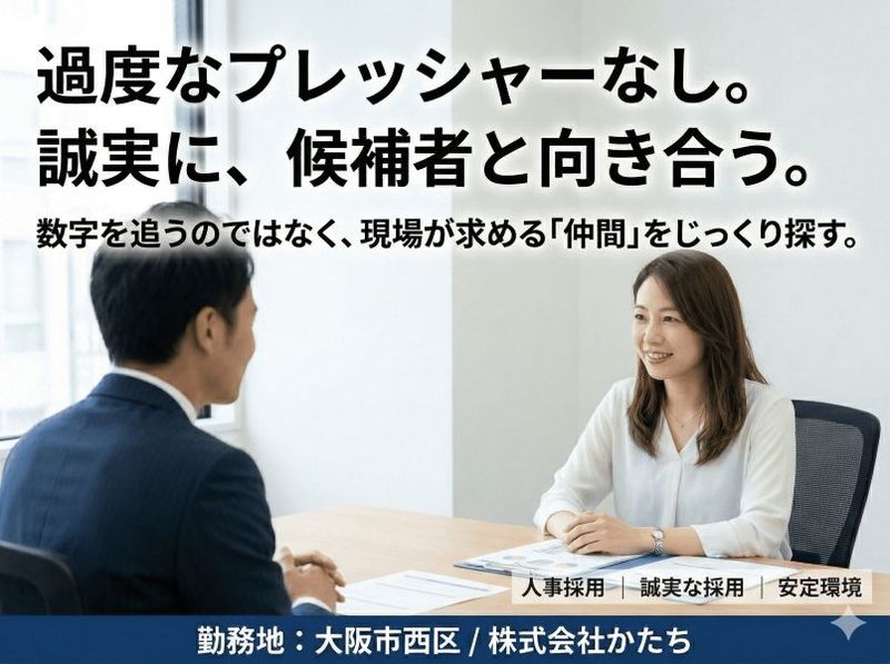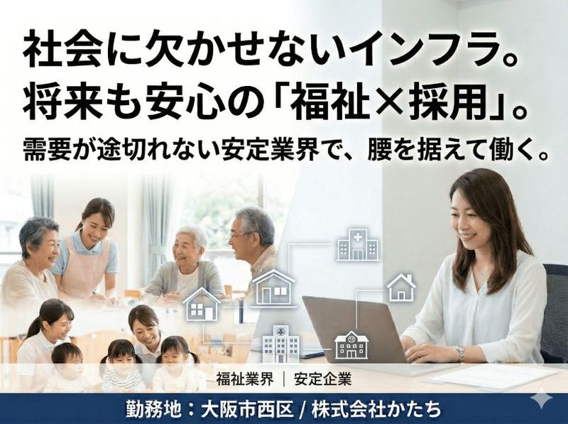 アピールポイント: 「株式会社かたち」は、障がい者向けIT支援や児童発達支援など、社会インフラとして欠かせない福祉事業をグループ全体で20拠点以上展開しています。不況に左右されない圧倒的な安定性が、あなたのキャリアを支える土台となります 。 現在の本町オフィスには40代のベテラン人事2名が在籍しており、賑やかすぎる環境というよりも、一人ひとりが自分の業務に静かに、深く集中できる、穏やかな組織文化が根付いています。周囲と協力しつつも、自分のペースで着実に専門知識を吸収したい方には最適な環境です。 人事は、経営資源である「ヒト」を支える企業の中心部門です。経営陣のすぐ側でグループ全体の組織づくりに携わる経験は、将来どんな業界でも重宝されるプロフェッショナルへの第一歩となります 。社会貢献を実感しながら、自身の市場価値を磨けるこの場所で、新たな挑戦を始めませんか。