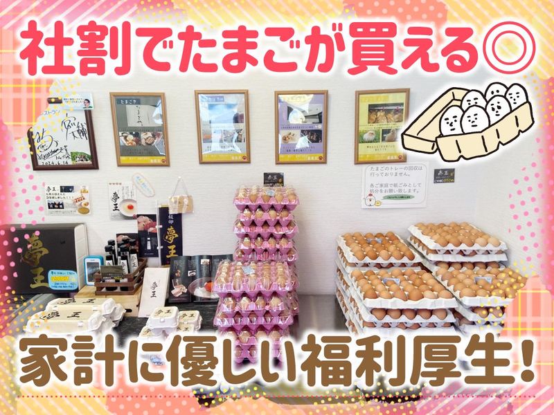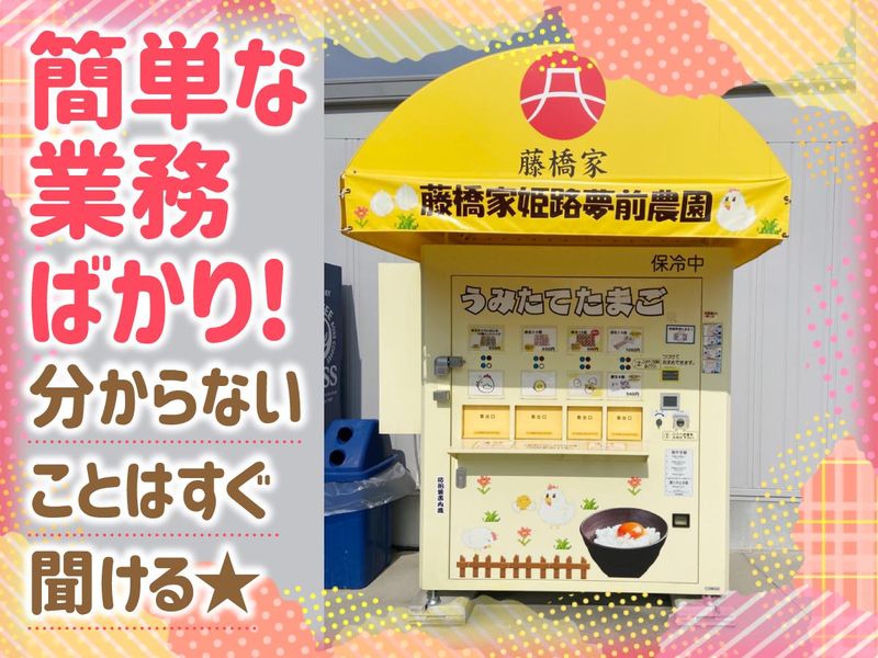 仕事内容 \週2日×6時間勤務♪ 扶養内OKで働きやすい◎/ ⭐卵の社割ありで家計にも優しい♪ ⭐車通勤OKで通いやすい! ⭐休憩室・給湯器・ロッカー室も完備! ⭐店内は冷暖房完備で快適◎ ///////////////////////////// *お電話での応募もOK! TEL:079-268-9077 *WEB応募はらくらく30秒♪ 「応募する」ボタンから ①氏名 ②生年月日 ③連絡先 を入力するだけ! ///////////////////////////// ■お仕事の詳細 ―――――――――――――――――― 直売所での販売、接客対応をお願いします◎ ・卵の荷だし/陳列 ・自動販売機の補充(カンタン作業のみ♪) ・お客様の接客 ・レジ業務 ・開店・閉店作業 など ⏩簡単な作業からお願いします♪ ⏩接客未経験でも、丁寧に対応できればOK◎ ⏩2人体制だから安心です! ■ブランクOK!主婦パート活躍中! ―――――――――――――――――― 久しぶりのお仕事復帰も応援♪ 2人体制なので、分からないことは 先輩スタッフにバトンタッチできます◎ 💡ちょこっと嬉しいポイント💡 ここで売っている商品を社員割引価格で買える! 毎日料理に使う卵、最近高くなりましたね… 「質のいい卵×割引」がとっても嬉しい◎ と働く主婦さんから好評です♪ 土日祝働ける人、歓迎!! ■株式会社藤橋商店について ―――――――――――――――――― 大正4年に創業以来 「食」を支える事業を行ってきました。 持続可能な社会の実現に向けて 農業と畜産の循環型事業を推進しています。 笑顔と喜びと活気に溢れたスタッフと 仕事を楽しみながら、 お互いに支え合える職場を目指しています。