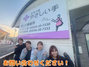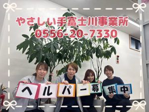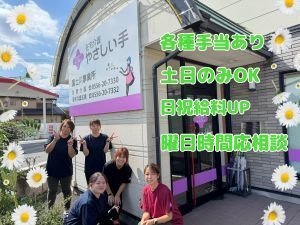 PR やさしい手甲府は、地域の皆様に介護を提供すると共に、高齢者が住み慣れた地域社会で、安心した生活が送れるよう総合的な在宅介護サービスを行っています。 富士川訪問介護事業所は、サービス提供責任者4名、ヘルパー18名の働きやすい事業所です。 バリバリの働き盛り世代、経験豊富なシニア世代、フレッシュな子育て世代、様々な年齢層の職員が活躍していて、小規模でアットホームな雰囲気の訪問介護事業所です。 未経験でも安心 「介護資格を取ったばかりで未経験だけど大丈夫?」 「昔に介護資格を取ってから時間が経つけど本当に働けるかしら?」 ブランクのある方、初めての方も登録時に介護研修をしますので、安心して介護のお仕事をスタートできます。 また、お仕事開始後も毎月ヘルパーさんが集合するミーティングにて、介護実技研修や介護サービス等の勉強会も開催しますので、スキルアップもできます。 働き方は相談可能週1日~、1日1時間~OK 「朝の時間帯だけ/夕方の時間帯だけ働きたい」 「家庭と両立しながら働きたい」 「まずは短時間から始めてみたい」 まずは、ご希望をお聞かせください。 交通渋滞なく通勤時間、移動時間短縮できます。 職員の声 Aさん:空いた時間に家に戻って家事に手が付けられるので、その日の仕事が終わって帰宅した後の家事が楽になります。 Bさん:希望していた休日の変更や体調不良などで急に休まなければならない時にしっかり対応してくれるので安心。 Cさん:Wワークをしていますが、希望する時間や曜日で働けるので両立しやすいです。 ◆◆お仕事説明会随時開催中◆◆ 詳しくは下のURLをクリック↓↓ http://www.yasashiite-kofu.co.jp/recruit/#t1000583 やさしい手 甲府は、新型コロナウイルスの対応として、感染予防や皆様の健康、働きやすさを大切にしています。 ・出勤時には検温での健康管理や、事業所入り口にはアルコール消毒液での消毒を徹底しています。 ・お子様が学校をお休みになっても、皆さんの働きやすさを大切にしておりますので、働き方について是非ご相談ください