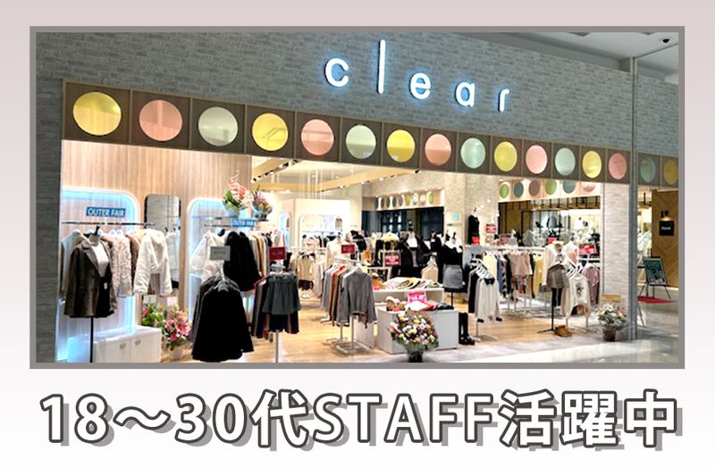 アピールポイント: 10~20代に人気の ファッションブランド「clear」 18歳~30代の方が活躍中! 安定シフトで収入も安定◎ _________ 【オシャレ自由♪】  ̄ ̄ ̄ ̄ ̄ ̄ ̄ ̄ ̄ 服装はもちろん、 髪型、髪色、ピアス、ネイル自由! 自分らしいスタイルで働けます。 _________ 【社員登用あり】  ̄ ̄ ̄ ̄ ̄ ̄ ̄ ̄ ̄ 「やりたいことがわからない」 「そろそろ腰を落ち着けて働きたい」 なんて方も大歓迎! 接客や商品について、先輩スタッフが 丁寧にレクチャーをするので コレを機に手に職を付けたい という方も大歓迎!