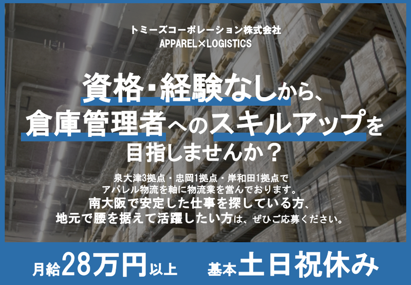 仕事内容 私たちの物流現場で、衣類や日用品、作業着まで幅広く取り扱う倉庫での 倉庫管理スタッフとして、現場の中心となって活躍していただきます。 【主な業務内容】 ・商品の入出庫作業・搬送・在庫整理 ・倉庫内でのピッキング・梱包作業 ・パートスタッフの作業進捗確認・サポート・簡単な指導 ・作業効率や安全性を意識した倉庫内環境の整備 ・現場のスムーズな運営をサポートするためのチーム管理 【仕事の特徴】 入社後はまず現場作業からスタートし、商品の取り扱いや倉庫業務の基本を習得。 業務に慣れてきたら、パートスタッフの管理や現場の効率化、簡単なマネジメント業務にステップアップ。 経験を重ねることで、倉庫全体の管理者として拠点運営や改善提案にも関わることができます。 また、フォークリフト免許をお持ちでない方もご安心ください。 会社が資格取得を全面的にサポートしますので、入社後に働きながら免許取得が可能です。 【ここがやりがい】 ●倉庫作業と管理業務を両立でき、現場力とマネジメント力の両方を身につけられる ●自分の判断や声かけで現場の流れを改善できるため、直接「ありがとう」の言葉につながる ●将来的にはセンター長補佐やセンター長など、管理職ポジションへのキャリアアップも可能 【入社後のキャリアイメージ】 現場作業スタッフ:入出庫・梱包・ピッキングの習得 フロア管理者:パートスタッフの進捗管理や指導、効率化の実施 倉庫管理者:倉庫全体の運営・在庫管理・改善提案 中長期:センター長補佐・センター長・課長・部長などの管理職 【安心のサポート体制】 初めて倉庫管理に挑戦する方も、現場スタッフから段階的にステップアップ可能です。 また、フォークリフト資格の取得支援制度があるため、未経験からスキルアップ、キャリアアップを目指せます。