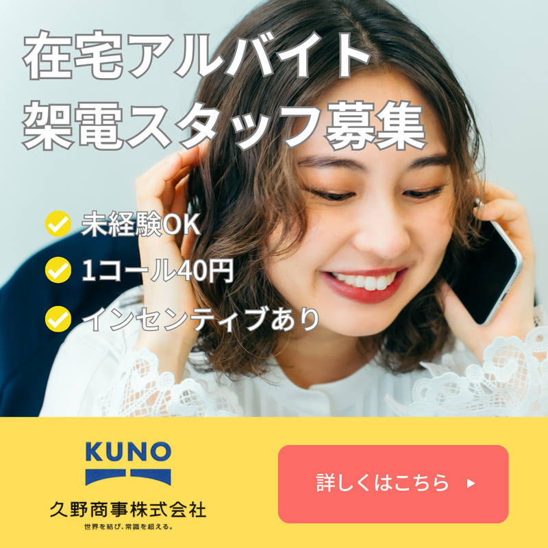 仕事内容 \自宅でできるアルバイト業務/ 【お任せする業務内容】 提供するリストに記載の法人企業への コール業務をお任せします! 【ココがポイント!】 ★架電数で時給が変わる ★ちょっとした頑張りで収入UP ★1日1.2時間の空いた時間も有効活用できる ★自宅・在宅で働ける ★ちょっとしたお小遣いにも 1コール40円という出来高でのお支払いになりますので 1時間に30件コールで1200円、50件で2000円…と頑張りに応じて時給を上げられます。 さらに、1アポイント獲得で3000円のインセンティブも発生✨ 在宅でスキマ時間にお仕事が出来ちゃいます◎ 未経験大歓迎! お仕事はじめは社員が商品などについて説明をさせていただきますので、 経験・スキルが無くてもご安心ください◎ ◎シフトも応相談!  ̄ ̄ ̄ ̄ ̄ ̄ ̄ ̄ ̄ ̄ ̄ ̄ ̄ ̄ ̄ ̄ ̄ ̄ 学生さん~主婦(夫)まで大歓迎! 「大学4年でなかなかシフトに入れない…」 「家事育児の合間で少し稼ぎたい…」 「社会人になる前に電話業務を経験しておきたい…」 「掛け持ちしてがっつり働きたい!」 など理由は何でもOK! 働く日数や時間は柔軟に対応できます♪ 短期間だけ集中勤務もOK! ※架電先は法人企業の方になるので平日の9時~19時の間で勤務をお願いします。