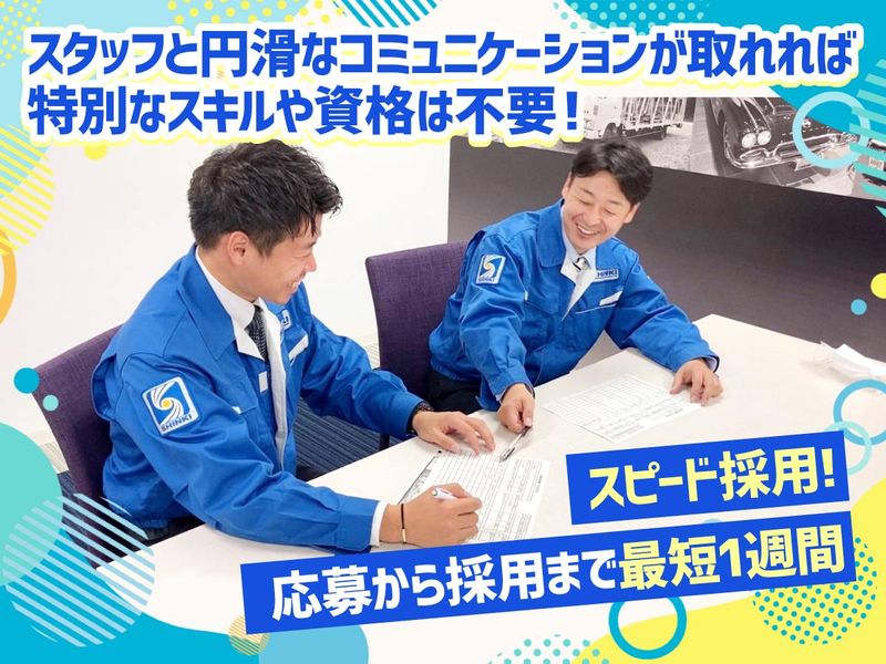 仕事内容 ////////////////////////////////////////// 【即日勤務も大歓迎!】 最速1週間で内定&スタート! 「今すぐ働いてガッツリ稼ぎたい!」方も 応募から内定まで最短1週間の スピード採用で即座に収入を得られます! もちろん、「現在の仕事を終えてから」 「年明けから」など、希望に合わせた 柔軟な入社日設定も可能です! ////////////////////////////////////////// \✨新着求人!✨/ レア!オークション会場でのお仕事! ✅車が好きな方必見! ✅普通運転免許があればOK! ✅未経験・異業種からの転職も大歓迎★ ✅初めての正社員という方もOK! ✅丁寧な研修有 ✅安全運転ができれば 特別な経験や資格は不要です◎ ※長期勤続によるキャリア形成のため 40歳未満の方の採用になります。 (例外事由3号のイ) お電話での応募・お問い合わせも可能! TEL:090-9280-7779 【⭐お仕事内容】 国産車から輸入車まで様々な車が集まる オークション会場の開催にあたり、 スムーズに運営を進めていくお仕事です! ⏩車をオークションに出品するための準備 具体的なステップは… ①出品車を撮影室まで移動 ▼ ②内装を撮影 *専用のスマホで 運転席、後部座席の撮影 ▼ ③外装を撮影・出品番号の割り振り *2人1組で パソコンを使って車の外観撮影と キーボードで選択して番号割り振り ▼ ④敷地内の指定された展示場まで移動 ⏩会場内の車の移動・整理 *出品車とそれ以外の車の仕分け作業 *引き取り待ちの車両の整理 *翌週出品予定の車両準備 など ⏩スタッフ管理 現在、アルバイトも含め男女スタッフが 元気に活躍中! ゆくゆくはアルバイトのシフト管理、指導、 教育、研修などをお願いします! ⏩作業進捗チェック アルバイトの方と関わりながら 一緒に作業を進めていただきます◎ など、幅広い業務に携わっていただけます! 初めて携わる業務もあるかと思いますが サポートしますのでご安心くださいね◎ HP:https://www.shinki-web.jp/ - 【⭐頑張りや成果をしっかり評価!】 年功序列の仕組みではないので 頑張りでドンドン昇給することが可能◎ 現場をまとめられるスキルが身につけば 責任者としてステップアップする チャンスもあります! 主任・課長・部長などの役職に就くと、 役職手当も支給されますよ! 【⭐特別なスキルや資格は不要!】 スタッフと円滑なコミュニケーションが 取れれば特別なスキルや資格は不要です◎ 毎日40~50名のスタッフが出勤し、 そのメンバーをまとめていくお仕事です。 ゆくゆくは朝礼やミーティングで 皆の前に立って話す機会もあり、 なかなかできない貴重な経験も積めます。 「アルバイトスタッフをまとめてきた」 などの経験がある方なら、 そのスキルを存分に活かせますよ◎ スタッフは年齢や性格も様々のため、 多種多様な人との出会いや会話が 業務の楽しみや刺激になります。 【⭐お仕事の特徴】 *普段あまり見かけない珍しい車に出会える *相談しやすい&話しやすい雰囲気 *気さくなスタッフが多く居心地バツグン! *異業種から入社した人も多く在籍! *アルバイト経験しか無い方も活躍中! 【⭐働きやすさ抜群!】 ・賞与あり(年2回) ・基本的に希望休は通りやすい環境! ・シフト:1ヶ月ごとに決定 ・月休み:8~9日 ・長期休暇: GW、夏季、年末は各6~8日ほどの休み 【⭐きっかけはなんでもOK】 特別なスキルや経験は一切不要! 「なんとなく興味があった」 「趣味を活かしながら働きたい」 「前職と違う業界で働いてみたかった」 そんな理由で応募した方も多くいます 【⭐一緒に働くスタッフについて】 アルバイトはフリーターさん・主婦さん シニアの方など幅広く活躍中! 優しい先輩が多いので初めてでも安心です◎ 基本は各自モクモクと作業していますが、 休憩中には雑談で盛り上がることも。 困ったことも親切にサポートしてくれるので 新人さんもすぐ馴染めます!