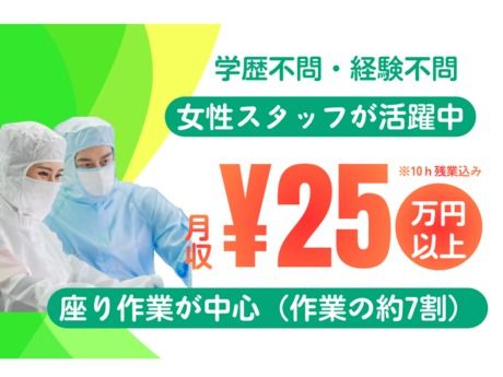 資格 ◇20代・30代・40代幅広い年代のスタッフが活躍中♪ ・経験不問 ・学歴不問 座り作業が多いので、体への負担も少なめ♪ 適度に体を動かしながら作業できます◎ ☆コツコツ真面目に取り組める方大歓迎!☆