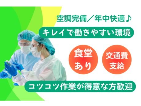仕事内容 仕事について 医薬品や化粧品の容器を専門に製造している メーカー企業でのお仕事です♪ 製造マシンから流れてくる完成品を目視で検査を行い、 不具合の発見と書類の記入をお願いします♪ +*具体的には*+ - ・アルミ製品の目視検査 ・完成品の品質管理検査(計測器を使用) ※1日のうち座り作業が70%ほどです◎ コツコツ・もくもくとできる作業が好きな方にピッタリです☆ +*1日の流れ*+ - ・出勤:私服から作業服に着替えます!(クリーンルームに入るための準備) ・午前:朝礼◎前の時間帯の引継ぎ事項や注意点、本日の生産予定数を確認◎ ・昼食:1時間の休憩♪作業服から私服に着替えて休憩します♪ ・午後:作業開始!作業開始前に担当ラインの変更などがあれば対応します! ・終了:作業テーブル周りの片づけ・報告や引継ぎ内容をまとめて終了です♪ +*職場環境*+ - ・1年中空調完備!20℃前後の環境です◎ ・女性スタッフがメインで活躍中! ・食堂あり ・弁当持込OK(食事スペースあり) ・仕出弁当あり ・自動販売機あり ・休憩室あり ・喫煙所あり 分からないことなどあれば、先輩スタッフがフォロー するので、未経験でも安心です♪ 実際現場で働くほとんどの先輩スタッフは 未経験からスタートしています◎ アピールポイント *もくもくとできるシンプルな作業! *集中して作業したい方にオススメ♪ *馴染みのある日用品だからイメージしやすい! *週払いも可(規定あり) 分からないことなどあれば、 先輩スタッフがフォローするので安心です♪