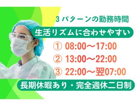 シフト制 勤務時間 ・勤務時間: [1] 08:00~17:00 [2] 13:00~22:00 [3] 22:00~06:00 ・実働8時間/休憩60分 ※残業あり ☆その他の時間帯もあります☆ ・13:00~22:00 ・22:00~6:00 (22:00~5:00は時給1750円!)