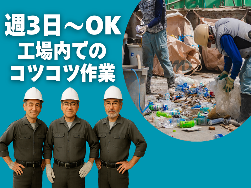 仕事内容 << 求人のポイント >> ✅未経験&無資格歓迎!年齢不問! ✅工場内でのコツコツ軽作業 ✅シフトの融通抜群!週3日~勤務OK ✅午前だけ・午後だけの勤務も可! ✅1日6時間程度の時短勤務もできます ✅昼食付き*車通勤OK ━━━━━━━━━━━━━━━━━━ >>具体的な仕事内容 ――――――――――― 産業廃棄物処理における 収集処理→中間処理 →リサイクル→最終処理まで トータルで行うリサイクル工場内でのお仕事! 建設現場で発生した木材・スクラップ・ プラスチックなどの廃棄物の仕分けを 行う作業をお任せします。 *取り扱う廃棄物は、 1人で持ち運べる程度の重さの物のみ! 重量物はございません! *1つひとつの作業に、 コツコツ丁寧に向き合える方、 集中して取り組む事が得意な方に ピッタリのお仕事です! >>職場環境 ――――――― 未経験で始めたスタッフばかりなので 経験がない方も心強い環境です。 入社後は、先輩が一から仕分けのコツを お教えするので、必要な知識・資格・経験 などは一切なし。 未経験の方も安心してご応募ください! >>会社について ――――――――― 環境事業を行う「株式会社IWD」の 中間処理業務を支える当社では 持続可能な社会に向けた取り組みの 一端を担っています。 創業35年以上の安定した企業のもとで コツコツと確かな仕事に向き合える職場 です。 >>会社ホームページ ――――――――――― https://www.clover-968.com/