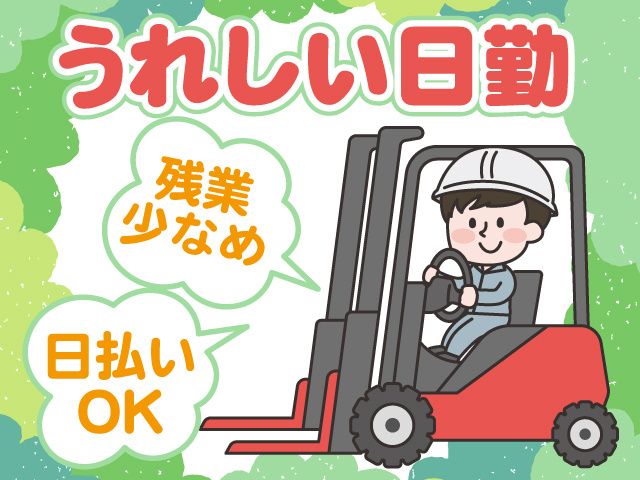 仕事内容 プラスチック成型工場内でのフォークリフトオペレーター募集! 日払い・週払いOK 月収21万円以上も可能 車/バイク/自転車通勤OK! 綺麗な職場環境! 残業少なめ! <具体的には・・・> 主にリーチフォークリフトを使用し、製品の倉庫収納(2段棚入れ)や 入出荷準備(棚出し・シール貼り)をお願いします。 その他、原材料の受入れ、仕入れ品や資材・製品の管理、空調完備の職場での 段ボール組立なども担当いただきます。 ※フォークリフト乗車の割合は高めです。 商品アイテム数が多く、格納場所等覚えるまで大変ですが、フォロー体制も万全ですので、ご安心ください。 <月収例> ・21日勤務(残業なし)の場合 210,000円(1250円×8H×21日) <中高年者活躍中> スキル重視の採用ですので 60歳の方でもご相談ください! まだまだ現役で働きたい方にオススメ! リーチフォークリフトや物流業務の実務経験を活かして 当社で活躍しませんか? 「無理なく働きたい」 「稼げるお仕事がしたい」 「コツコツできる作業がいい」 「地元で仕事を探している」 なんて方にもオススメ! <うれしい日払・週払OK> 「すぐにお金が欲しい」という方や 「月末まで待てない」という方は 日払・週払で即お給与GET WEBでの面接も可能ですのでお気軽にご応募ください。