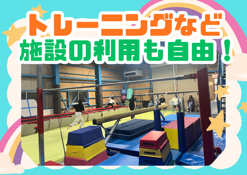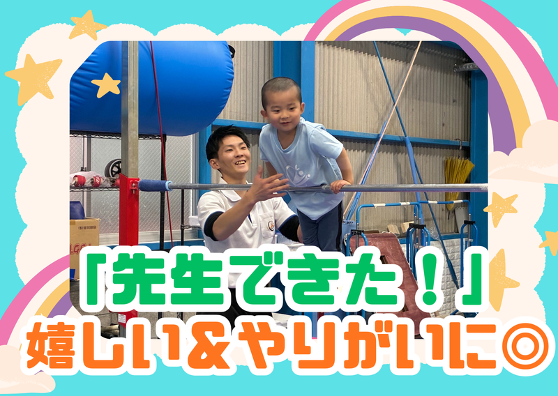 仕事内容 / 「先生、できた!」がやりがい◎ 子どもたちのヒーローに★ \ ☆+..+☆+..+☆+..+☆+..+☆+..+☆ ✅週1日〜・1日短時間OK! 学生活躍中! ✅未経験OK!先生のお手伝いからスタート ✅子どもが好き!それだけで応募OK♪ ✅施設利用自由!トレーニングも無料◎ ☆+..+☆+..+☆+..+☆+..+☆+..+☆ 【仕事内容】 “子どもが好き” その気持ちだけで大丈夫! 未就学児〜小学生を対象に、マット・跳び箱・鉄棒などを教えます。 メインで教える先生のサポートがあなたのお仕事! 難しい技術を教えることはないので、運動が得意でなくても大丈夫! ~具体的には~ *「順番に並ぼうね~!」といった子供たちへの声掛け *マットや跳び箱の準備・お片付け *子供たちが安全に練習できているかの見守り *できた時に一緒に「すごい!」とハイタッチ! などなど…♪ ◎まずは子供たちと明るく「こんにちは!」と挨拶ができれば100点満点です! \⭐20代~30代スタッフ活躍中⭐/ 「スポーツが好き!」「体を動かす仕事がしたい!」「家から近い!」「体操をやっていた経験を活かしたい!」など様々な志望動機で入社しています! 共通しているのは【子どもが大好き!】という気持ちです! ⏰1日のスケジュール例⏰ 12:00/出勤・掃除・ミーティング 13:00/レッスンの準備・SNS更新 15:30/クラス開始(1コマ60分×数回) 19:30/片付け・事務作業 20:00/退勤!お疲れ様でした! *☆*―――――――――――――― 研修制度あり◎ あなたを一人にしません!! ________________*☆* 将来、教育関係に進みたい方 こどもに関わる仕事がしたい方 という学生さんにピッタリ★ 先生が常に隣にいる「バディ制度」があるので、一人きりにさせることはありません。教え方は先輩が横で丁寧にお手伝いするので、バイトデビューの方も安心してください! *☆*―――――――――――――― 週1日から相談OKです! ________________*☆* とにかくシフトの自由度が自慢です! 平日は14時から、土日は朝からなど…決まった時間割の中からあなたの都合に合わせてシフトを組めます◎ 「テスト期間は休みたい」 「子どもの学校行事がある」 「旅行に行きたい」など、プライベートの予定は遠慮なく相談してください!