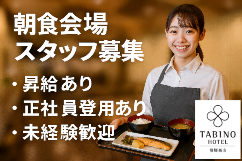 仕事内容 【未経験歓迎】安心の研修でしっかりとお仕事を覚えられます◎ たびのホテル飛騨高山|レストランホール・調理補助スタッフ募集《週2日〜OK》社員登用あり 昇給あり 時給1,065円~ パートアルバイト 雇用形態:パートアルバイト 【主な業務内容】 ホテルレストランホール業務・調理補助業務 ・お食事配膳 ・食器片づけ ・テーブル案内 ・料理盛り付けなど ホテル朝食に関わる業務全般を担当していただきます。 様々な経験を通してスキルが身につきます! 自然と成長できる環境です。 【◇勤務】 シフト制 例 ①朝5:00~8:00 ②朝5:00~12:00(休憩45分) ③朝5:00~14:00(休憩1時間) ※あくまで一例です 希望あればご相談ください! 週2日~相談OK(フルタイム歓迎、希望があればご相談ください!) 【◇給与】 時給:1,065円〜1,300円 ※経験・スキルによって決定/昇給あり/社員登用あり 深夜手当・残業手当あり 【◇社会保険】 各種社会保険完備(健康保険/厚生年金/雇用保険/労災保険) 【◇福利厚生】 昇給あり 制服貸与 社会保険あり 残業手当 交通費規定支給(月額支給上限 40,000円) ★試用期間:3ヶ月(条件は本採用と同一) ☆★☆☆★☆☆★☆☆★☆☆★☆☆★☆☆★ 【様々な経験が積めるためスタッフ一人ひとりの成長が早く、メンバーの貢献度は大きいです】 ◎チャレンジを応援する社風です。ホテル業界で自分だけのキャリア作りに挑戦できます! ◎上質なおもてなしを学び、お客様や仲間、人の役に立つやりがいを日々感じられます! ◎スピード感を持って成長できます。早い方は入社後2~3年でリーダー等、ステップアップも目指せます! ◎週2日~で無理なく働きたい方、副業・Wワークの方も歓迎です! ☆異業種からの転職者も多数活躍中です! ☆★☆☆★☆☆★☆☆★☆☆★☆☆★☆☆★ 【サンフロンティアグループについて】 1999年に東証一部(現プライム)に上場後、安定した業績を重ね成長を続けてまいりました。 お客様目線の細やかなサービスで、「また来たい」と思わせるおもてなしの心は、国内外から高く評価されています。 お客様と仲間のために心から尽くす『利他』の心を軸に、今後も事業拡大、成長を続ける将来性のあるグループです。 【◇応募の流れ】 応募→書類選考→面接→内定 およそ2週間 応募ボタンよりエントリーまたはお電話 担当者よりご連絡します。 ☆面接当日にご体調がすぐれない場合は、ご無理をなさらずに面接日変更のご連絡をお願い致します。 ☆★☆☆★☆☆★☆☆★☆☆★☆☆★☆★☆ ◎未経験の方でも、安心の研修制度があるためご安心ください。 助け合い仲間のために働く社風です。若手、ベテラン問わず良い意見をどんどん賞賛し、推進する経営ポリシーがあるため、向上心があり、ホスピタリティ精神に溢れた従業員が多く活躍しています! ☆★☆職場の一つ一つの改善点を、あなたの持つ長所で大きな伸びしろに変えてみませんか? ☆★☆お客様の「ありがとう」の言葉を頂くために、共に一生懸命に働いてみませんか? ◎◎他にはない、あなただけの強みを当社グループホテルで発揮して頂く事、尽くすことで得られる喜びを感じ、日々成長し、豊かになっていける手助けをしたいという思いがあります。