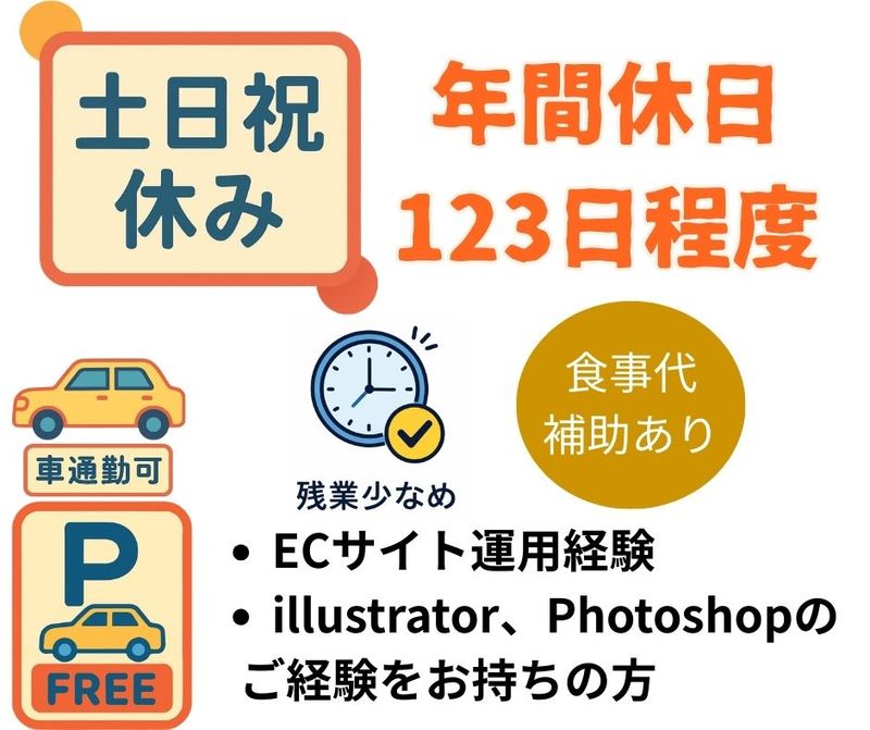 ECサイト運用経験illustrator、Photoshopのご経験をお持ちの方!土日祝休み(完全週休2日制)年間休日123日◎