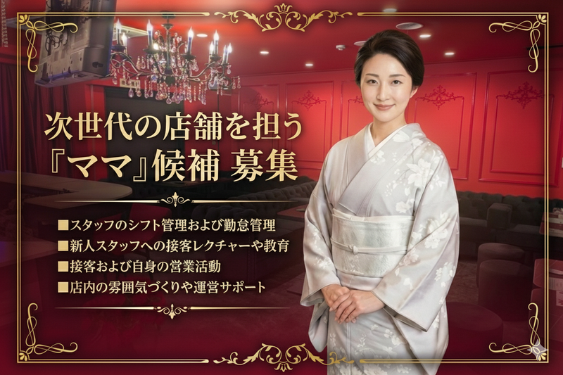 仕事内容 オープンしたばかりの、 新しくて綺麗なお店です。 営業感の強い接客ではなく、 まずは自分自身が楽しむことが 一番のお仕事。 経験や年齢を気にせず、 フラットな人間関係の中で、 心地よい「大人の接客」を スタートしてみませんか? ■『A CLUB(エークラブ)』について■ お店のコンセプトは、 おうちに帰る前の、 ちょっと優雅な1杯 ――。 高級感のあるオシャレな内装ながら、 価格はリーズナブル。 そしてあたたかな雰囲気が漂う、 地元の方に愛されるお店を 目指しています。 ギラギラした雰囲気はなく、 スタッフもお客様も穏やかに過ごせる そんなアットホームな職場です♪ ・・・………………………………・・・ 【 お任せする業務について 】 店舗運営の要となる 「お店のママ」として、 以下のような業務をお任せします。 もちろん、最初からすべてを お任せすることはありません◎ ■スタッフのシフト管理および勤怠管理 ■新人スタッフへの接客レクチャーや教育 ■接客および自身の営業活動 ■店内の雰囲気づくりや運営サポート お客様との接し方などを イチからやさしく業務をレクチャー。 一緒に少しずつ成長していきましょう。 お客様とのやりとりや立ち居振る舞いなど 学びがたくさんあると思います! ・・・………………………………・・・ ▶▶▶ オープニング募集 フラットな人間関係だから 馴染みやすく気軽にスタートできるので、 未経験の方もブランクのある方も 始めやすい環境です。 ▶▶▶ コンセプトは「大人の隠れ家」 「ふらっと立ち寄り、 おしゃれな空間でゆったり飲む」 がお店のテーマ。 騒がしい雰囲気ではなく、 お一人や少人数で 上質なお酒の時間を楽しまれる方を 想定した店作りをしています。 落ち着いた空間だからこそ、 過度な心配をせず、 あなたらしく丁寧な 接客に専念できる環境です。 ▶▶▶ 未経験スタート者も活躍中。 ブランクからの復帰も応援しますので、 安心してご入社ください◎