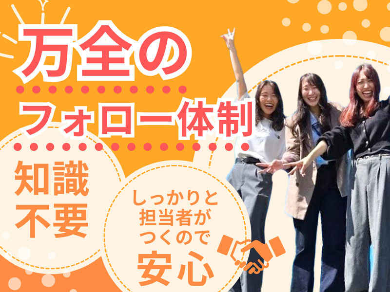 選考プロセス 応募確認後、こちらから 折り返しのご連絡をいたします。 ▼会社説明・面接1回 ※オンライン面接 ▼採用! 面接日・入社日は応相談。 スピード選考も可能。 お急ぎの方、在職中の方も ご相談ください! \まずは話を聞くだけもOK / 仕事内容や気になること、 不安なことなど何でもご相談ください♪ ※※重複応募はご遠慮ください※※ お1人でも多くの方とお会いしたいため 重複応募はご遠慮いただいております。 何卒ご理解のほど宜しくお願いいたします。