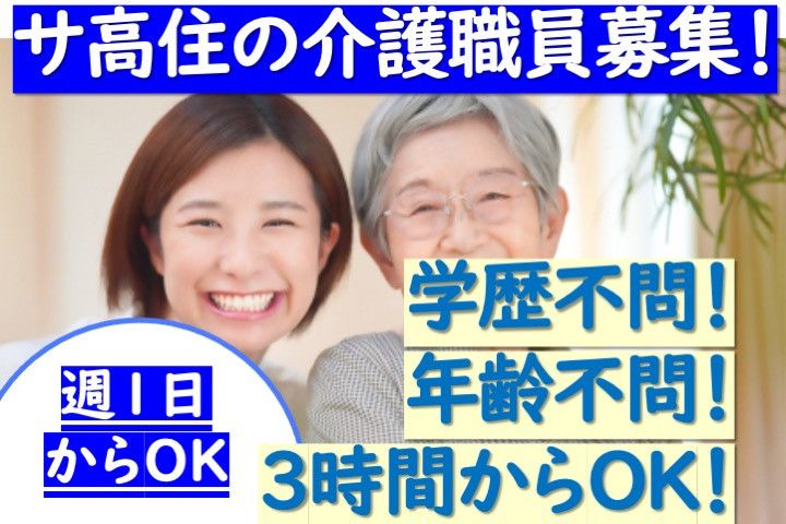 【アピールポイント】 サ高住の介護職員の募集です! ■年齢不問 ■学歴不問 ■週1日からOK ■3時間からOK ■ブランクOK ■残業ほぼなし ■無料駐車場あり