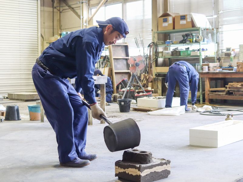 仕事内容 ===== 正解は、失敗の先にある。 僕らと一緒に、見つけてみませんか。 ===== 【 17年目・K課長より 】 ※写真 1枚目・右 1年目の新人さんなんて、失敗して当たり前。17年目の僕でも上手くいかない日はあるし、23年目のH部長 (写真 1枚目・左) ですら、一生勉強だって言ってるくらいですから。 鋳造っていうのは、そういう仕事。その日の天候や素材の状態など、複雑な要因が絡み合って品質が決まるから、経験値がそのままスキルになるんですよね。 しかも三興技研がやってるのは、「立体加飾 (りったいかしょく)」の入った特殊な鋳造。 一般的には、鋳物屋さんと加飾屋さん (鋳物の表面を削って模様を入れる専門業者さんのこと) の2社で分業する工程を、自社だけで一発で作っちゃう技術で、国内ではウチにしかできないんです。 ※自社調べ - 社内で製法を確立してから、およそ3年。まだまだ効率化の余地があるし、品質も上げていけると感じています。 例えば少し前には、製品を型から外す時のやり方を、僕の提案で大きく変えました。詳しく説明すると長くなるので省きますが、これで残業時間が半分くらいになったんですよ。 もちろん失敗するリスクもありましたが、部長や社長 (写真 4枚目・右) に相談してみたら「正解を見付けられるのは、この技術を持っているウチだけ。たとえ失敗してもそれが資産になるし、やってみよう ! 」と、背中を押してもらえました。 そんな社風ですから、新人さんのミスくらいは織り込み済み。ドーンと構えて受け止めますから、挑戦する姿勢だけは、忘れずにいてくださいね。 - 【 1日の流れ 】 つくるものは毎日違いますが、タイムスケジュールはほぼ固定されています。 1日当たりの生産量は、小さめの製品なら1人5個くらい、特大品なら2人で1個くらいです。 (1) 午前中/型取り 設計部門から届くモックアップ (木型といいます) を、専用の砂に埋めて押し固めてから、炭酸ガスを掛けて更に固め、「砂型」を作ります ※写真 2枚目 (2) 昼イチ/アルミを溶かす アルミ合金を炉に入れて混ぜながら、1時間くらい掛けて700℃近くまで熱し、液体にします (3) 14時頃/注湯 (1) で固めた砂型から木型を抜き取り、溶かしたアルミを流し込んで、しばらく冷やし固めます ※写真 3枚目 (4) 16時頃/脱型 砂型を分解し、外側から熱を加えて、アルミ製品を取り出します。欠けや気泡等の不良が無いか確認し、問題なければ加工部門へ渡します ※入社後はOJT研修からスタート。砂が積まれたパレットをフォークリフトや天井クレーンで移動させる、砂を押し固める際の力の入れ方を教わるなど、先輩がおこなう作業の補助や見学から始めていきましょう ※フォークリフトと天井クレーンの操作は、免許取得後にご担当いただきます。会社費用で外部講習に通っていただけますので、ご安心ください