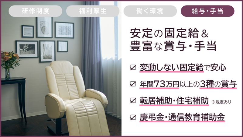 仕事内容 「どんな骨格の方にも、自信をもって 提案できる本当の“プロ”になりたい」 「歩合制じゃなく、きちんと毎月安定した お給料がもらえて昇給する環境がいい」 「何かあったときに店舗だけじゃなく、 本部のフォロー体制があると嬉しい」 「時間外のレッスンや自習による残業で、 家庭に影響があるのは困る…」 「もっと目の前のお客様 1人ひとりに寄り添った接客がしたい」 …でも、こんな所があったとしても、 自分のスキルが足りるか不安。 そんな方には、 デジャヴュ・オペラ・ハトムギ化粧水を 展開するピアスグループが展開する 当社「アナスタシア ミアレ」であれば、 これまでの不安や不満を解消し、 【自分の技術が好き】と胸を張って言える アイブロウスペシャリストを 目指していただけます。 組織が大きいからこそできる、 私たちの技術・フォロー体制・制度が きっとあなたの「働きやすさ」を 支えるはずです。 お忙しいかと思いますが、 こちらの求人では当社の想いを 知っていただけると思いますので、 ぜひ最後まで読んでいただけますと 嬉しいです。 ▼▼▼▼▼ ─────────────────── 技術・実績・ブランド力が 「予約が取れないサロン」の理由です ─────────────────── デジャヴュ・オペラ・ハトムギ化粧水を 展開する大手美容・健康メーカー 「ピアスグループ」傘下である アナスタシア ミアレ。 眉専門サロンのパイオニアブランドとして、 約20年にわたり延べ450万人以上の お客さまに自分だけの美しさを発見する お手伝いをしてきました。 完全予約制でお客様一人ひとりに寄り添った 施術をしており、なにより【技術】に 自信を持ったスタッフが多いのが特徴です。 ─────────────────── 下積みに2~3年?いえ、当社なら 約1カ月半で自信に満ちたプロにさせます! ─────────────────── アナスタシア ミアレには、 「夢だった美容師になったけれど、 アシスタントとしての下積み期間が 数年あり、他にアルバイトをして生計を 立てたり、講習会やミーティングへの 参加でちゃんとした休みが取れなくて、 諦めざるを得なくなった」という理由で 入社してきた社員も多数在籍しています。 頑張って取得された美容師免許です。 アナスタシア ミアレであれば、 その免許を活かして最短距離で “アイブロウのスペシャリスト”への道を 実現していただけます。 (もちろん、研修時のお給料も変動なく 満額支給いたします!) ※研修詳細については下記へ ─────────────────── 組織が大きいからこそ… ここにしかない福利厚生があります ─────────────────── <研修中> ■研修でのモニター様手配は会社で 全て行い、費用負担は一切なし ■研修中も給与・条件に変更なし ■遠方の方には食事つきのホテルをご用意 <働き方> ■月8日休みだけでなく、月10日休みもOK ■安定の固定給!昇給も早いのが特徴です ■賞与はなんと3種類支給! ■完済まで奨学金の返還を8割支援します ■転居費用20万・住宅補助5年間(規定あり) <ライフステージが変わっても安心> ■産休、育児休暇の取得率は100% ■育休取得後に復帰した方の人数: 24年度 1名、23年度 5名、 22年度 5名、20年度 4名 ╲╲奨学金返還支援制度// 新卒・中途問わず、 奨学金を返還中の方向けに毎月返還額の 80%を会社が負担する制度があります。 ピアスグループに勤務いただいている期間は ずっと、返還額の8割(月額上限12,000円)を あなたに代わって返還します。※規定あり 例えば月15,000円を返還されている方は、 弊社が代理で返還し内12,000円を支援。 差額の3,000円だけ給与から天引き(控除) いたします。 ★退職時に返却も必要ありません! ※その他の詳細は、給与や福利厚生欄を ご覧くださいね。 ─────────────────── 組織が大きいからこそ… 「もしも」の時のサポート体制が抜群です ─────────────────── 働いていると、 「業務に不安があるけれど、 先輩達は忙しそう…」 「先輩達やお客様とうまく コミュニケーションがとれないけれど、 誰にも相談できず悩んでいる…」などの 悩みが出てきてしまうことが、 どうしてもありますよね。 合うメンバーと働けることが一番ですが、 もし合わなかった場合に 他部署の先輩などに相談するなどの 逃げ道がないと辛いですよね。 そんな「もしも」を考えて ピアスグループ本社には アナスタシア ミアレ専属の 【キャリアサポート担当】という 新入社員に寄り添い、 不安や悩みの相談に乗り、 解決を支援する担当がいます。 もちろん先輩や上司を通さず個人で連絡も 可能なので、悩み事が深刻になる前に ぜひ一緒に考えさせてくださいね。 ★入社時から「仕事満足度」 「職場の人間関係」「健康」について 5段階の天気(晴れ、くもり、雨マーク)で 回答するコンディションアンケートも 実施しています!そこからも