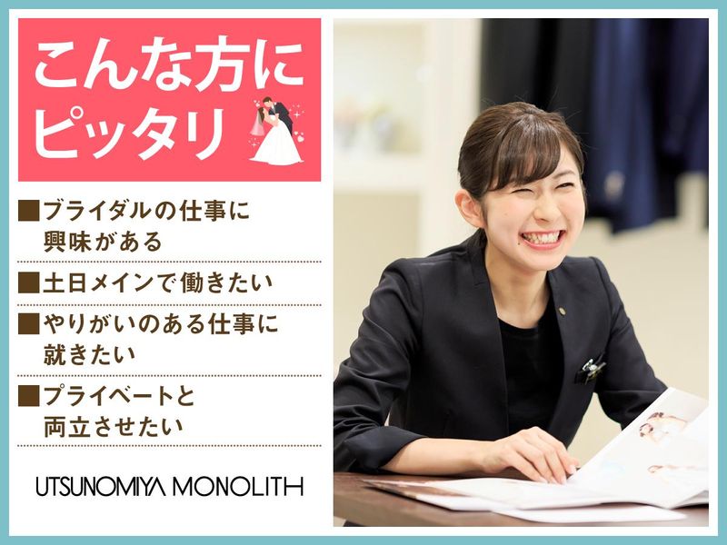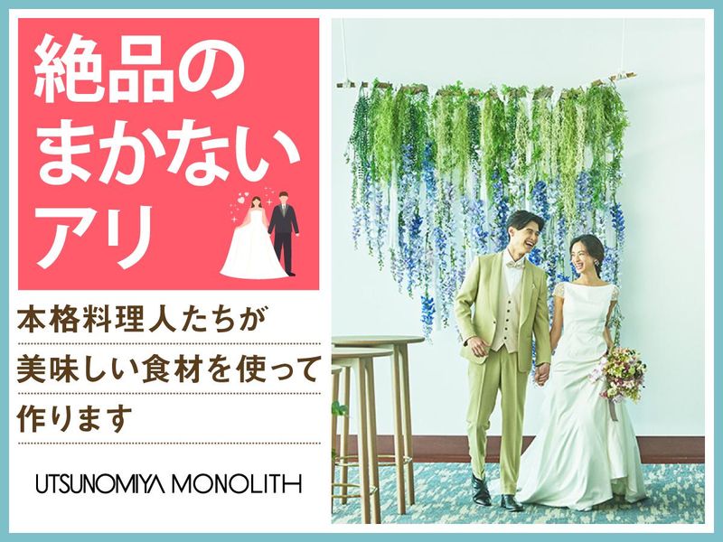 仕事内容 光と水が彩る一軒家を貸切にした結婚式場★ 感動いっぱいの結婚式を⼀緒にサポート♪ 週2日~1日6時間~OK◎ 絶品のまかないアリ(^^) *ブライダル業界未経験者歓迎* 「ウェディングプランナーになりたい」 「ブライダルの仕事に興味がある」 「かけもちで土日メインに入りたい」 「フルタイムでガッツリ稼ぎたい」 という⽅必⾒︕ スキルや経験は⼀切不要♪ ⼀緒に素敵な結婚式を演出しましょう* 宇都宮モノリスは 古くから守られる伝統美を現代的に表し 空間に時を織り込んだ結婚式場です◎ 今回は 「結婚式場のアシスタントスタッフ」を募集! プランナーやドレスコーディネーターが スムーズに業務を進められるようサポートします。 <主なお仕事内容は…> 結婚式場のスタッフとして 次のお仕事をお任せ ■新郎新婦様のご案内や来客対応 ■会場見学のサポート ■事務作業、電話対応 ■ドレスショップのコーディネーターの お手伝い ※PCの入力作業があります◎ ――――――――――――――― 具体的なお仕事の流れは︖ ――――――――――――――― ▶事務作業・電話対応 ・お客様からのメール対応 ・パートナー企業様への業務連絡 ・WEB媒体の操作(予約管理や口コミ返信) ▶来客・受付対応 打ち合わせにいらっしゃった 新郎新婦様のご案内や来客対応! ドリンクやお茶などをお出しします◎ ▶会場見学のサポート 新郎新婦様が快適に見学できるように 会場をご案内する際に扉を開けるなどのサポート! 会場見学が一通り終われば、 もう1度ドリンクを出してお見送りします◎ ▶ドレスショップのコーディネーターの お手伝い 社員のコーディネーターがご案内した衣裳を フィッテイングルームへ運び、 試着をしていただくための準備や メンテナンスなどを行います。 新郎新婦様と会話をしながら、 コーディネーターと一緒に運命の1着を探すお手伝いです! ⇒まずはカンタンなお茶出しなどからお任せするので未経験の方も安心です♪ ―――――――――――――――― フリーターさん・学生さん オススメポイント★ ―――――――――――――――― ・副業/Wワーク/かけもちOK! ・プライベートと両立しやすい! ・土日メインの勤務♪ ◎20代~30代女性が活躍中! スタッフ間は仲が良く、 雑談で盛り上がることも多いです♪ アルバイトパートから 契約社員へ昇格できる制度もあり! プランナーやドレスコーディネーターに 近い仕事を覚えて一緒に働くことになるので、 ノバレーゼで社員になりたい方は大きなチャンスです! ―――――――――――――――― ~ 働いているスタッフの声 ~ ―――――――――――――――― ◆スタッフAさん ブライダル業界に憧れていて、 最初は結婚式場スタッフの求人を見ていました。 たまたまここの求人を見たときに、 「ウェディングドレスに関われるって素敵!」 と思って入社!全く別業界での接客業の 経験のみでしたが、先輩たちが丁寧に 教えてくれたので、スグに慣れました◎
