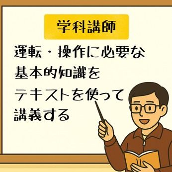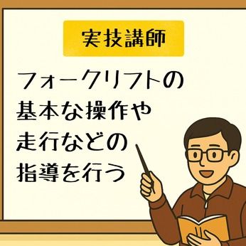 仕事内容 ■仕事内容 資格を取りに来られた方たちへ、講師としてフォークリフトの実技の指導や学科の講義を行うお仕事をお願いします。 ・実技講師…受講生にフォークリフトの基本的な操作や走行などの指導を行う ・学科講師…運転・操作に必要な基本的な知識をテキストを用いて講義・説明する 教える内容は決まっているので、定められたカリキュラム通りに講習を行います。 ・予約管理、スケジュール管理、受講者管理、報告書作成 受講者の予約状況や予約者への連絡、今後の講習スケジュール作成、 受講者後の履歴の作成、報告書の作成などを行っていただきます。 ・初日の駐車場誘導、休憩中のサポート、備品管理など、運営的な業務のサポートもお願い致します。 ■経験を活かして働ける! フォークリフトの経験をフルに活かして勤務していただくことが可能です。 ・講習内容は決まっているので、要点をしっかり押さえていただければ、講師未経験でも大丈夫です。 ・最初はベテラン講師が一緒に講習を行います。