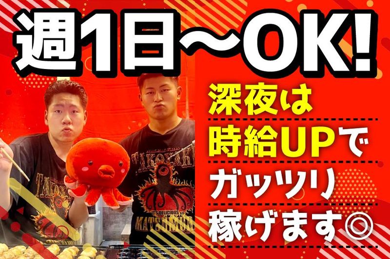 仕事内容 <髪色・ネイル自由でおしゃれも◎> <深夜は時給UPでガッツリも大歓迎!> まずは元気に挨拶ができればOK! 飲食店でのアルバイトが初めての方&ブランクがある方も大歓迎! 慣れるまで先輩スタッフが必ずサポートするので、 安心して業務を始めていただけます! 【簡単3ステップで少しずつお仕事を覚えよう!】 ①≪まずはメニューを覚えることからスタート! 10種類ほどあるメニューをまずは覚えていただきます。 ほとんどは見たことのある味ばかりですので 1週間ほどあればスグに覚えることができます! ②≪ステップ2≫たこ焼きのトッピングに挑戦! オーダーが入ったらメニューに合わせてたこ焼きに マヨネーズや鰹節をトッピング!3日程度でマスターできます◎ 同時に配達業務もお任せします! ③≪ステップ3≫たこ焼きを焼くことにチャレンジ! 最後は焼き場でたこ焼きを実際に焼いていただきます。 ・たこ焼き機に油をひいて ・鉄板が熱くなってきたら液を流し、具材を投入! ・固まってきたらコロコロ転がして形を整えて完成! 接客販売の経験がない方も、店長や先輩スタッフがイチから丁寧に教えるので安心です! 基本2~3名体制なので、分からないことや困ったことがあった時はスグに周りのスタッフを頼ってくださいね!