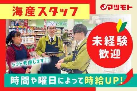 仕事内容 【 仕事内容 】 ■鮮魚の加工・パック詰め 刺身盛りの作成など ■商品の値付け・ラベル貼り 商品に値札シールを貼る パック詰めした商品を売場に陳列・補充 ■売場の整理・清掃 氷やトレーの片付け、作業台の洗浄 ■簡単な接客対応などをお任せします◎ 【 アピールポイント 】 < 時給アップ > 日祝・・・・ +100円 8時以前・・・+200円 17時以降・・+200円 地域の方に愛されるスーパー「マツモト」 京都・大阪を中心に展開する地域密着型のお店です! 明るく元気なスタッフが多く、職場の雰囲気も◎ アルバイトが初めての方でも安心して始められます。 シフトは柔軟に対応OK!学校や家庭とも両立しやすい! 品出し・レジ・惣菜など、希望に合ったお仕事をご用意。 自分に合ったポジションで、無理なく働けますよ♪ 【 アクセスの仕方 】 <国道9号線からのアクセス> 国道9号線を亀岡市方面へ進みます。 さらに国道9号線をそのまま進み、 「並河駅前」交差点を左折し、府道25号線に入ります。 府道25号線を進み、左手に店舗が見えてきます◎