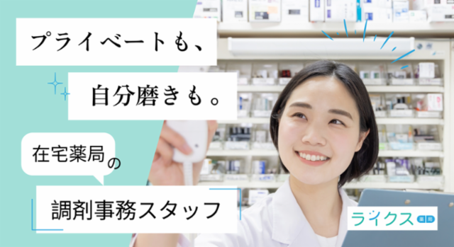 仕事情報 ● 仕事内容 【仕事内容】在宅医療に特化した薬局です。 外来対応はなく、事務業務に集中できる環境です。 ・処方箋の入力・レセプト業務 ・在宅訪問に関わる書類管理(介護保険関連書類含む) ・電話対応・業務連絡などのバックオフィス業務 ※訪問や薬剤師同行はありません。 調剤事務としての専門性を高められます。 学研グループの福利厚生 「プライベートも、自分磨きも。」 充実した福利厚生をご用意しています。 日々の生活から将来のことまで、働くあなたの「今」と「これから」をサポート。 一人暮らしでも、ライフイベントがあっても、安心して働き続けられる職場です。 この仕事のポイント ・外来対応ほぼなし!窓口業務がなく、落ち着いて事務作業に集中できます。 ・在宅医療の知識が身につく!特に介護保険に関する理解が深まります。 ・残業は月10時間前後。比較的安定した業務量です。 “調剤事務のスキルを活かして、安定&安心の環境で活躍しませんか?” 1日の流れ 9:00 出勤、お掃除、朝礼、前日のFAX処理、電話対応 9:30 保険の登録確認、介護保険の算定 10:00 往診完了後の処方箋入力、物品発注 11:30 順番にお昼休憩 13:00 往診完了後の処方箋入力 16:00 処方箋の裏打ちや、店舗備品発注 17:30 レジ締め・日報処理 18:00 片付け・退勤 「今日もお疲れ様でした!」 ライクス薬局について ライクス薬局は、処方せん調剤だけでなく、 高齢者施設や患者さまのご自宅に訪問する在宅訪問薬局(訪問薬剤管理指導等)を行なっています。 “介護と医療をつなぐ架け橋”として、すべての方が安心して年齢を重ねられる社会を目指しています。