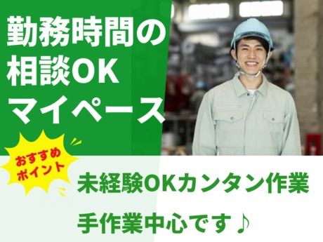 勤務時間 08:30~17:30 (実働7時間45分/休憩75分) ★残業は任意なので無理せず出来ます。 ★9時~17時等の時短OK! ★希望に応じて残業の調整可能 ※残業なし、もOK! ★組立業務のタイムスケジュール 08:30~ 朝礼 08:40~ 組立スタート 10:30~ 小休憩。 12:00~ 昼休憩!食堂、車の中等、自由に休憩できます! 12:50~ 休憩終わり。昼からまた頑張りましょう! 13:30~ 昼礼。仕事の状況等を共有したりします。 15:00~ 午後休憩 17:30~ 退勤!お疲れ様でした!