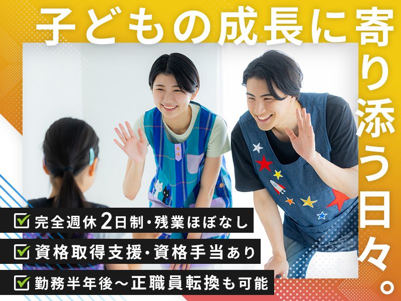 アピールポイント ✅子育てママ・パパ在籍中 ✅女性活躍中/男性スタッフも活躍中! ✅女性管理職登用実績あり 障害者施設で働いていたスタッフが多く、 元気なメンバー揃いです! <スタッフインタビュー> 職員それぞれが、児童一人ひとりに なにが必要かを考えて、より良い支援を していこうと努力している職場です。 風通しもよいので、やってみたいことも 提案しやすく、成長できる環境です!