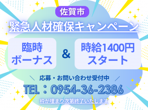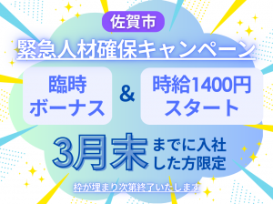 【佐賀県佐賀市】時給1400円スタート+臨時ボーナス33万円支給!土日祝休みで残業ほぼなし☆