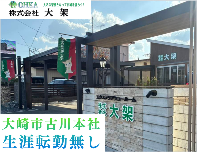 仕事内容 ✅地域を「守り」「創る」仕事を。宮城県北部をを中心に社会インフラと住まいを支える。✅ 大崎市古川にて創業14年。 代表がまだ40代前半と若く、 未来に向けた事業拡大を 現在、進めている最中です。 公共工事・民間工事・そして自社ブランド。 施工管理としての経験を 最大限に活かせる多彩なプロジェクトを より強化していく為に ご一緒に推進してくれる方を探しています。 <仕事内容について> 土木施工管理として様々な工事を 仲間と一緒に進めていきましょう。 大崎市古川本社の為、 生涯に渡って転勤はございません。 これまで培った技術や知見を 宮城の為に活かす機会として頂ければ これ程、嬉しいことはありません。 現場は大崎市、加美町、黒川郡、仙台市、石巻市が中心です。 ✅大架の施工管理は一つのジャンルに縛られない。 <公共工事> 災害復旧・インフラ整備における、 河川・山地の醸成、道路、下水道などの公共工事の実施。 大崎市からは「優良工事賞」を2年連続で受賞しています。 地元の安全、人々の生活を支える役割です。 <民間工事> 本社ショールームを拠点として一般住宅向けに、 デザイン性の高いエクステリアや 外構工事のディレクションなど様々な施工を実施しています。 学校や施設からもご依頼を頂く事が多い為、 実際にご利用されている人々の姿を見られる事も やりがいの一つです。 <自社不動産・宅地造成> 2025年は自社施工での戸建て販売を実施しました。 そして今年2026年はリノベーション物件に挑戦しています。 今後は自社ブランドとして、不動産販売も強化する為、 戸建て販売に伴う、土地の宅地造成から関わるなど 土木施工管理として実績強化に役立つ経験が出来ます。 ✅生涯転勤無し、その為、腰を据えてキャリア形成が出来ます。 現代において、特に施工管理職は 日本中から重宝されています。 AIが発展してきた現在においても、 「実際に人の目が入り、現場を創る。」という事は 人でしか出来ない事であり大切な工程です。 大架のスタイルとしては 自社施工案件をより強く増加させていきます。 その中、土木施工管理に関わるスタッフが 「公共工事」「民間工事」「自社ブランド工事」の 3軸を同時並行で経験していく事は ご本人にとって独自のキャリア形成を描く道筋になると考えます。 ✅3ヶ月~半年~1年先の転職でのご相談応募でも構いません✅ 良い出逢いがあればぜひご入社頂きたいところですが、 現在のお立場もあるかと思いますので、 気軽にご応募を頂き、WEBでの転職相談であったり、 大架での働き方や条件、キャリア形成をお聞きする時間を こちらから設ける事を考えています。 仲間は会社の財産であり、 当社は一人ひとりを「人財」として見ています。 仲間の活躍が拡がる事で大架はもっと良い会社になる。 あなたと共に会社が大きな飛躍を遂げられるように 切磋琢磨しながら、共に成長を続けていければ幸いです。 ✅社用車貸与の為、車での通勤なども安心✅ 大崎市古川の立地の為、 基本的には車通勤の方が 多くなると考えています。 その為、通勤にも使用出来る 社用車の貸与を実施しています。 ※高速道路費用においても、 月3万円までの支給となります。 ガソリン代も別途支給です。 ✅柔軟性が高い代表。40代前半ですがじつは創業14年の経営経験。✅ 大架は現代表が20代の時から育ててきた会社です。 それでも新たに自社不動産事業の展開など、 まだまだ、挑戦が尽きる事はありません。 この先も新しい価値を提供する為には仲間が必要です。 地元に戻ってきたい方や、新しい土地で挑戦したい方、 様々な経験が積める事は間違いありませんので、 まさに事業の第二草創期として 更に磨き上げて、ご一緒に力を発揮できる方を探しています。 ✅大架のHPはこちら✅ https://ohka.jp/ ✅大架のInstagram✅ https://www.instagram.com/new_ohka.oosaki/