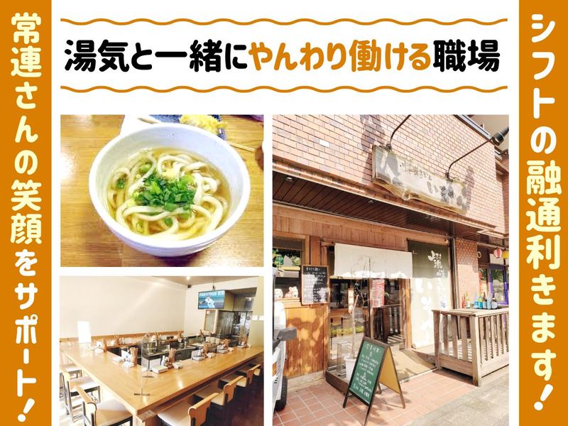 仕事内容 ~未経験OK!ホールスタッフ募集!~ シフト融通◎プライベート充実しやすい! ご家庭がある方はそちらを優先した頂いて大丈夫です! バイトデビューでも安心! お気軽にご相談ください♪ 【あなたにお任せする仕事内容】 ・接客 ・会計 ・簡単な調理補助 などなど ★ポイント★ ・未経験OK!丁寧な研修があるので、 飲食店での経験がなくても心配いりません! ・シフト相談OK! 学生さん、主婦(夫)さん、 フリーターさん大歓迎♪ ・アットホームな職場 働きやすい雰囲気で スタッフ同士も仲良し! <オーナー・礒口(いそぐち)より> 周りからはそのまま「店長」って呼ばれています! 店名は名前のいそぐちから取りました◎ 元々10年ほどサラリーマンをしていて やりがいのある仕事がしたいと思い 香川出身でうどんが大好きなのもあり うどん屋を立ち上げました。 2004年12月1日にオープンして もう少しで20周年になります。 リーマンショックの時や東日本大震災、 感染症が流行った際は 当店にも少しダメージがありましたが 常連さんが足繁く通ってくださるおかげで 続けてこられました。 25年目、30年目に向けての目標は これまで通り丁寧に続けていき、 常連さんをもっと増やしていきたいです! <当店のうどんはこだわりたくさん!> 手打ちのうどんと出し汁、どちらも本当に大事にしており 天然素材を使用しイチから出汁をとっています。 うどんは、「季節」「気温」「湿度」に応じて作り方を調整しております。 シンプルな料理だからこそ 飽きの来ない味を追求しています。 初心を忘れず、なんでも丁寧にやり続けることが 物事を長く続けるコツだと思ってます。 平日は常連さんがほとんどで 土日は初めての方が多く来店されます♪ 妻がお客様の多い土日祝日に 手伝ってくれる時もあります◎ お客様へ丁寧なサービスができるように スタッフ・家族みんなで頑張っています! <ディナータイムについて> 夜は居酒屋としても営業しています! お酒を飲んで、締めでうどんを食べるのが 当店のオススメコースです♪ 人気のおつまみは出汁の効いたおでんと揚げたての天ぷらです◎ 美味しい日本酒もたくさん用意してあります! ※日曜日は昼のみ営業です 最低限のマナーがあればOK!人柄重視で採用します。 夜は常連さんが話しかけてくれることが多いので、 フランクに受け答え出来るととても助かります♪ 仕事は後から覚えていただければ大丈夫です。 仕事に関して慣れるまでは、 時間はたくさんあるので、ゆっくり丁寧に覚えてください。 1つずつ段階を踏んで覚えてもらえればOKです。 スタッフみんなが気持ち良く働けるような 環境を整えています。