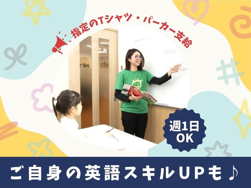 職場環境 学生さんや主婦さんが活躍中! 講師は未経験という方も アルバイト自体が 初めてという方も歓迎! 「英語は好きだけど、 人に教えたことがなくて心配」 という方も心配不要! まずは1日の流れや授業の進め方など 丁寧な研修からスタートします! 喫煙所:なし(敷地内全て禁煙)