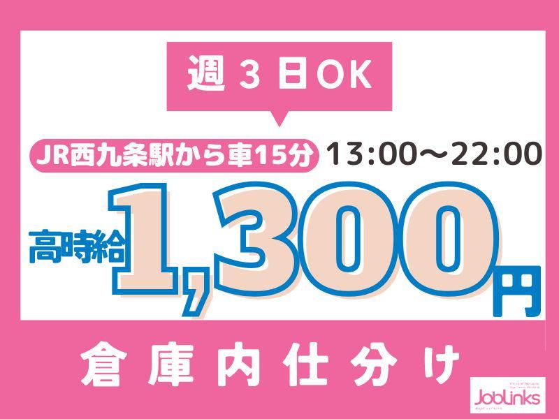 【保険制度】 雇用保険、労災保険、健康保険、厚生年金 待遇・福利厚生 【福利厚生】 当社オープニング! 週2日~フルタイムOK! 倉庫内作業のお仕事です☆ ◆週払いOK(規定有り) ◆交通費支給(原則、全額支給) ◆有給休暇付与(6ヶ月継続勤務) ◆各種保険完備(雇用・労災・健康・厚生年金) ◆apアプリポイントプレゼント! ◆プロ野球チケットプレゼント(阪神ファン必見♪♪) ※土日祝日に頂いたご応募に関しましては、 翌営業日に順次対応させていただきます。 【NAA】 6620912 ☆JR西九条駅から車で14分 ☆阪神・九条駅から車で15分 ★車・バイク・自転車通勤OK ★分煙(喫煙所あり) ★残業はほとんどなし! ★制服貸与