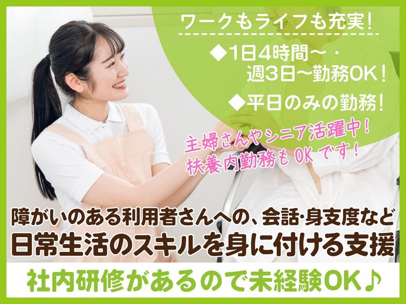 仕事内容 【幅広い年代が活躍中*シニアも応援】 未経験から活躍するスタッフが多数! 自分自身も、利用者さんと一緒に 成長していけるのがやりがいの一つ。 障がいを持つ方の就労支援施設で、 福祉の仕事に挑戦してみませんか? -------------------- *1日4時間~、週3日~勤務OK! *土日祝日固定休み!平日のみOK! *未経験OK!主婦さんやシニアも活躍中! -------------------- 【仕事内容】 障がいのある利用者さんに対して、 積極性・会話・身支度など、日常生活での スキルを身に付ける支援を行います。 <就労継続支援B型事業所とは・・・?> 障がいや難病などで一般企業への就職が 困難な方が、雇用契約を結ばずに 勤務することができる福祉サービス事業所 【具体的には】 *地域の皆様のお手伝い *観葉植物の制作、販売 *花や野菜の栽培・収穫・販売 などをトータルでサポートします。 難しい作業はないので「教えられるかな?」 と不安に思わなくても大丈夫です! 分からないことは先輩スタッフに すぐに聞きやすい環境です。 未経験スタートの方も多数活躍中! ”温かく接することができる方” 歓迎! コミュニケーションを積極的に取り、 利用者さんの成長を見守っていきましょう! -------------------- 【当社について】 相談支援・訪問介護・地域生活支援・ 日中一時支援など、利用者1人ひとりに あった支援を提供しています。 協力・関連機関と連携し、 本人はもちろんご家族様の大切な時間に 彩りが加わるよう全力でサポートします。