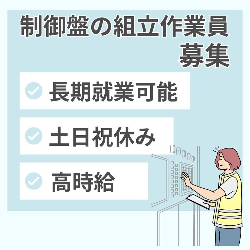 仕事内容 〓〓 お仕事内容詳細 〓〓 電気制御盤の組立作業になります。 図面を見ながら配線のカット、組立、各種調整作業をお願いします。 作業によっては、はんだを使用する場合もあります。 電気系の知識や製造経験が活かせるお仕事です。 〓〓 ここがポイント! 〓〓 << 日勤のみ >> 大人気の日勤の時間帯です。 夕方に終業するので家族や友人とのプライベート充実 << 長く働ける >> 長期就業可能な方、大歓迎! 慣れるまで先輩社員が手厚くサポートしてくれるので、 安定している会社で安心して働けます。 ※就業前に、職場見学が出来ますので見て納得、安心して働くことが出来ます。