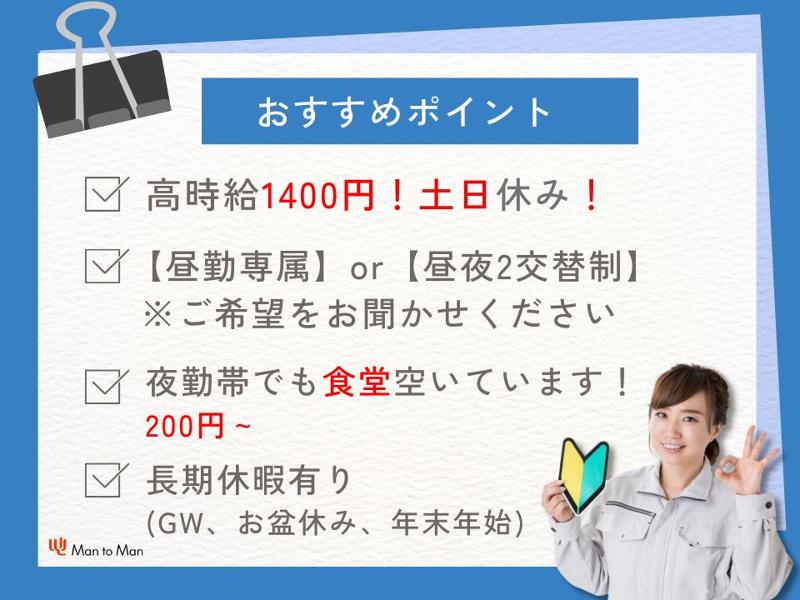 勤務時間・曜日: 【勤務時間】 【昼勤専属】or【昼夜2交替制】 ※ご希望をお聞かせください 昼勤 8:00-17:00(休憩 12:00-13:00) 夜勤 21:00-6:00(休憩 1:00-2:00) 【残業時間】 月に20~40時間程度 【期間】 3ヵ月以上~長期 長期勤務できる方OK 派遣社員から直接雇用(正社員・契約社員等)の 実績多数あり! Man to Manでは毎年平均10~20名の方が 派遣社員から派遣先の直接雇用に 切り替わっています。 中途採用で入社することが難しい大手企業でも 派遣社員として業務に励んでいただくことで、 正社員や契約社員などになれる チャンスもあります!
