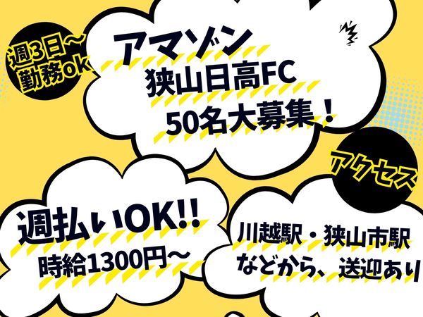 交通アクセス 最寄駅:川越駅 <勤務地> Amazon狭山日高FC 埼玉県狭山市広瀬台4丁目5番 LOGI'Q狭山日高 *マイカー・バイク・自転車通勤OK(規定有) *交通費全額支給&駐車場の貸し出しあり(規定有) <無料送迎バス運行> 川越駅・狭山市駅・入間市駅・東飯能駅より、無料の送迎バス運行中!