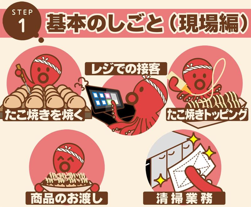 選考プロセス ご応募後、担当者より2日以内にご連絡いたします。 面接は勤務希望の店舗(現地)にて実施いたします。 実際の職場の雰囲気や通勤経路などを確認しながら、 勤務条件や希望の働き方をお伺いします。 当社ならではの「たこ焼き面接」も実施しています。 焼きたてのたこ焼きを食べながら、 お店の空気やスタッフの雰囲気を感じていただけます。 選考結果は、面接後おおむね10日以内にご連絡いたします。 入社時期や勤務開始日は、ご希望に合わせて柔軟に対応いたします。 少しでも気になった方は、ぜひお気軽にご応募ください。