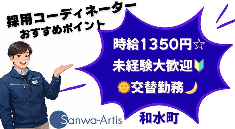 選考プロセス ―――ご登録について――― ① オンライン登録 スマホやタブレット、PCがあればいつでも登録ができます。 ※履歴書は不要です。 ② サンワアルティス事務所での面談登録 住所▶熊本県菊池市泗水町吉富205-4 ①または②のいずれかを選べます。 どちらも事前予約が必要となります。 ご希望は採用窓口までご連絡ください。 <採用窓口> TEL▶0120-880-889 【派遣元責任者より】 本日は数あるお仕事の中から、サンワアルティスの求人をお読みいただき、誠にありがとうございました。 お仕事条件はご希望に沿う内容でしたでしょうか。 また、わかりづらい表現などはございませんでしたでしょうか。 少しでも不安な点やご応募前に確認したい点などございましたらどうぞご遠慮なくお問い合わせください。 このお仕事(本求人では)は情熱あふれるコーディネーターが、あなたの専属担当としてご希望条件のヒアリング、職場見学、お仕事開始後のお悩み相談を責任もってご対応いたします。 最後になりますが、本日はご閲覧いただき誠にありがとうございました。 心より御礼申し上げます。 派遣元責任者 派遣事業部 次長 穴井 雄輔 080-8560-7040