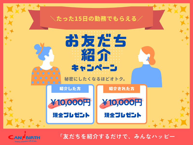 選考プロセス 応募ボタンより必要事項を入力のうえ、送信してください。 \\⭐応募後の流れ⭐// ①応募ボタンを押す ▼ ②担当者より、メールまたはお電話にてご連絡 ▼ ③登録面談の日程予約(WEB面談・出張面談・来社面談の中から選択可◎) ※当日予約もOK ▼ ④担当者と登録面談(ご希望の働き方などお知らせください◎) ※履歴書不要・私服でOK ▼ ⑤職場見学 ▼ ⑥双方合意のもと採用決定! ▼ ⑦お仕事スタート 【登録地】 キャニバース株式会社 所在地:埼玉県久喜市野久喜547-17-205 担当者:キャニバース株式会社 採用担当 電話番号:0480470305 メールアドレス:contact@canibirth.co.jp <応募について> WEBまたはお電話にてお気軽にご応募ください。 ■WEB応募の場合 24時間365日、いつでも受付可能です。 確認後、担当よりご連絡します。 ※WEB応募後、応募完了メールがすぐに届きます。 迷惑メールに振り分けられていないかご確認ください。 ■電話応募の場合 0480-47-0305までお電話ください。 受付時間は10時~17時となります。 ※繋がらない場合は時間をおいてお電話いただけますと幸いです。 ※オンライン面談をご希望の場合は、WEB応募をご利用ください。 <面接について> オンライン面談/来社面談/出張面談からお選びいただけます。 ご希望があればお申し付けくださいね。 面談ではお仕事に関するご希望のヒアリングや、担当からお仕事の説明を行います。 説明を聞いてからのキャンセル・変更も可能なので、まずはお気軽に面談へご参加ください。