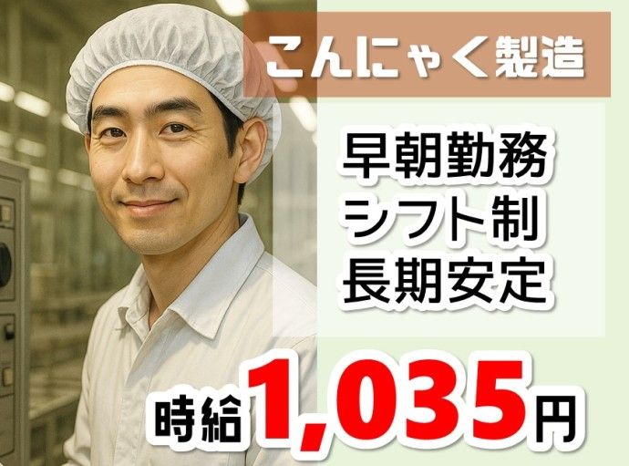 仕事内容 \スーパー向けこんにゃく製品の製造スタッフ募集/ ライン作業中心!シンプル作業で未経験でも安心♪ 日勤・早朝勤務のお仕事! 大手スーパー向けの食品工場で、こんにゃく製造ラインの作業をおまかせ♪ 20代~60代の男性が多数活躍中の現場です! ━━━━━━━━━━━━━━ ■ お仕事内容 ■ ━━━━━━━━━━━━━━ ・原材料(こんにゃく粉や水など)の準備 →決まった量を容器に移す、運搬など ・機械への材料投入 →材料を投入し、ボタン操作。あとは機械が自動で製造します ・出来上がったこんにゃくの取り出し・成形チェック ・使用後の機械の洗浄や片付け ※基本は立ち作業です ※10kg前後の重量物の取り扱いあり ※ライン作業が中心で、作業手順も決まっているので未経験の方も安心! ━━━━━━━━━━━━━━ ■ ここがポイント ■ ━━━━━━━━━━━━━━ ・シフト制/早朝6:00スタート!朝型の方にぴったり ・敷地内に駐車場完備 ・20代~60代まで幅広い年代の男性が活躍中 ・長期で安定して働きたい方歓迎 ━━━━━━━━━━━━━━ ■ NCIで働こう ■ ━━━━━━━━━━━━━━ ☑ 担当営業が手厚くサポート ☑ 社会保険完備・即日加入OK ☑ 誕生日やイベント時にプレゼントあり ☑ 未経験チャレンジ歓迎!