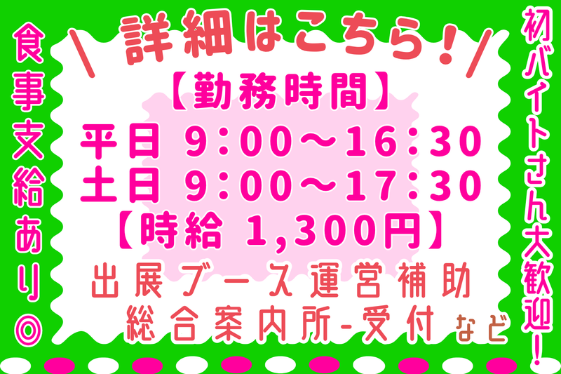 勤務時間詳細 [勤務時間] 平日_9:00~16:30(実働6.5h) 土日祭日_9:00~17:30(実働7.5h) *事前研修の勤務時間は9:00~17:00を予定 *会場撤去の作業もあります(時間未定)
