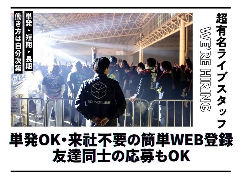 仕事内容 ✅超人気イベントの舞台裏が見れる! ✅来社不要のリモート登録会 ✅初バイトや未経験者もOK! ✅大学生・フリーターなど様々な方が活躍 ✅好きなタイミングで勤務可能◎ ✅高日給でガッツリ稼げます♪ ================== ライブやフェスの運営スタッフを 大募集しております! 登録制なので、まずは登録だけでもOK! 登録しておけば好きなタイミングで 働くことができますよ◎ 超人気イベントの舞台裏が見れるかも! 当社ならではの登録制レアバイト✨ 大学生さん・フリーターさん・ Wワーカーさんなど たくさんの方が活躍中の職場✨ 初心者さん、単発も大歓迎です! 友達同士の応募もOK◎ 大人気イベントを支えながら 楽しく一緒に働きませんか?? ▼こんな仕事をお任せします!  ̄ ̄ ̄ ̄ ̄ ̄ ̄ ̄ ̄ ̄ ̄ ̄ ̄ ̄ ̄ ◆イベント会場での ステージ機材準備、片付け ◆お客様の案内、誘導 ◆グッズ販売(売り子) ◆ステージ最前列の簡単な警備 ◆その他付随する業務 など 大人気イベント多数あります! あの有名人にも会えちゃうかも?! ▼未経験・バイトデビューOK!  ̄ ̄ ̄ ̄ ̄ ̄ ̄ ̄ ̄ ̄ ̄ ̄ ̄ ̄ ̄ ほとんどが簡単な業務なので バイトデビューや未経験の方でも 安心して働いていただけます! 現場には、 先輩スタッフがいるので 先輩スタッフの指示に従って 業務をお願いします。 ▼シフトは嬉しい自己申告制!  ̄ ̄ ̄ ̄ ̄ ̄ ̄ ̄ ̄ ̄ ̄ ̄ ̄ ̄ ̄ 【シフト例】 ◆予定が空いている日に働く学生さん ┗週1~2日の勤務 ◆スキマ時間で働くWワークさん ┗週1~3日の勤務 ◆ガッツリ働きたいフリーターさん ┗週4~5日の勤務 ✅1日のみの単発OK ✅まずは登録だけでもOK ✅自分に合った働き方ができます! ▼勤務地  ̄ ̄ ̄ ̄ ̄ ̄ ̄ ̄ ̄ ̄ ̄ ̄ ̄ ̄ ̄ ・LaLa arena TOKYO-BAY ・千葉市蘇我スポーツ公園 ・幕張メッセ ライブ、フェス、アイドル握手会など お仕事場所多数あります! ▼<首都圏の主なお仕事>  ̄ ̄ ̄ ̄ ̄ ̄ ̄ ̄ ̄ ̄ ̄ ̄ ̄ ̄ ̄ 【1月】 1/20(火) Zepp DiverCity(TOKYO) 1/23(金)〜24(土) Zepp Haneda(TOKYO) 1/24(土)〜25(日) 東京ガーデンシアター 1/25(日) Zepp Shinjuku(TOKYO) 1/30(金)〜31(土) 日本武道館 1/31(土)〜2/1(日) Kアリーナ横浜 【2月】 2/4(水) LIQUIDROOM 2/15(日) Zepp DiverCity(TOKYO) 2/17(火) LIQUIDROOM 2/28(土) EX THEATER ROPPONGI 【3月】 3/7(土)〜8(日) LaLa arena TOKYO-BAY その他多数あり! 他にも・・・ ROCK IN JAPAN FESTIVAL、COUNTDOWN JAPAN、JAPAN JAMなどの大型フェス、 東京ドーム、日本武道館、横浜アリーナ、Kアリーナ横浜、幕張メッセ、さいたまスーパーアリーナライブや、アイドル握手会etc.お仕事多数あり!!! 空いてる時間を、有効活用しませんか?♪ ▼弊社のHPも是非ご覧ください!  ̄ ̄ ̄ ̄ ̄ ̄ ̄ ̄ ̄ ̄ ̄ ̄ ̄ ̄ ̄ https://soundcube.co.jp/wanted/