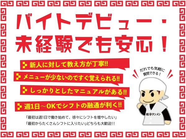仕事内容 ●・。★───────────────── ▼▼ 岐阜タンメンで働く魅力! ▼▼ ✨週1日~OKでシフト融通が聞く! ✨メニューが少なくマニュアル完備で未経験でも安心! ✨間違えても優しくフォロー!次に活かせばOK♪ ✨人が良すぎて辞められない♪ ─────────────────★。・● 【仕事内容】 ✅注文取り(トッピングや辛さ、麺の硬さを伺います) ✅簡単な調理(最新の機械を利用!ケガ・やけどの心配なし!包丁を使う事も99%なし!) ✅洗い物 ✅簡単な拭き掃除 ✅閉店業務(翌日の食材の解凍、床掃除、調理器具の洗浄) ―――――――――――――――――― ❖わかりやすい動画マニュアルのおかげで初アルバイトでも安心! ❖機械はスイッチの場所や手順を覚えるだけ! ❖「へいっ!いらっしゃい!」の声がお店に響き渡る、明るく元気な職場です! ❖常連さんも多いですよ! ―――――――――――――――――― \ 正社員登用あり / アルバイト・パートとして働きながら希望に応じて 正社員へのステップアップも可能です! もちろん正社員としての応募もOK。 あなたに合った働き方からスタートできます! ―――――――――――――――――― ⭐YouTubeチャンネルも開設⭐ https://www.youtube.com/channel/UCuhhYLNvYMVaibUxHg_cncg ⭐インスタ更新中!⭐ もっとお店の雰囲気が見てみたい…という方は ぜひInstagramのアカウントを見てみてください! @gifu_tanmen で検索をお願いします♪ 新商品の紹介など、ほぼ毎日更新中です! ▄▀▄▀▄▀▄▀▄▀▄▀▄▀▄▀▄ WEB面接も実施中! ご希望の方はお気軽にどうぞ! ▄▀▄▀▄▀▄▀▄▀▄▀▄▀▄▀▄