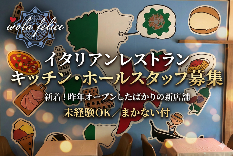 求めている人材 ✅未経験者大歓迎!(実務経験がなくてもOK) ✅ブランクOK ✅学歴不問!中卒・高卒OK ✅資格不要、無資格OK ✅年齢不問 ✅フリーターさん大歓迎! ✅学生可 ✅同業態の経験者優遇 ✅業種からの転職歓迎 ✅社員登用希望の方歓迎 ≪こんな方にピッタリ≫ ◎コミュニケーションが好きな方、接客が得意な方 ◎イタリアンに興味のある方、好きな方(お客様に説明等していただくため) ◎長期働いてくれる方歓迎 ◎元気な接客のできる方歓迎