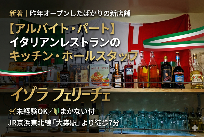 仕事内容 ╭━━━━━━╮ ✨お仕事内容✨ ╰━━━━━━╯ 大森駅近くに昨年オープンしたばかりの「イゾラ フェリーチェ」。明るく開放的な店内は、常連様で賑わうアットホームな空間です。 今回の募集では、キッチン業務をメインにお任せしたいと考えております。調理の仕事が初めてという方も、基礎からじっくり学べるサポート体制を整えておりますので、どうぞ安心して飛び込んできてください。ここで身につく技術は、一度覚えれば決して消えることのない一生モノの財産になるはずです。 【具体的には…】 ●調理、盛付 ●仕込み ●ドリンク作成 ●接客、レジ ●バッシング、洗い物 など ╭━━━━━━━━╮ ✨お勧めポイント✨ ╰━━━━━━━━╯ ◎髪型、髪色自由! 自由なスタイルで働けます♪(ネイル、ピアス、ひげもOK!) ◎まかない無料! お店の美味しいまかないが食べられますよ♪ ◎交通費全額支給! 電車通勤の方にウレシイ♪ ◎正社員登用制度あり! スキルアップ・キャリアアップを目指す方、応援します♪ ◎ブランクOK! Wワーク希望の方も大歓迎です♪ ◎勤務日数は応相談! まずは、あなたの希望を教えてください♪ 特に、週4、5日しっかりとシフトに入って活躍してくれるレギュラー志望のフリーターさんは大歓迎です。「そろそろ一つの場所に腰を据えて働きたい」という安定志向の方も、「将来は自分のお店を持ちたい」「何かのスペシャリストとして胸を張れるようになりたい」という高い目標を持つ方も、私たちはその熱意を全力で応援します。あなたの新しい挑戦を、スタッフ一同心よりお待ちしております。