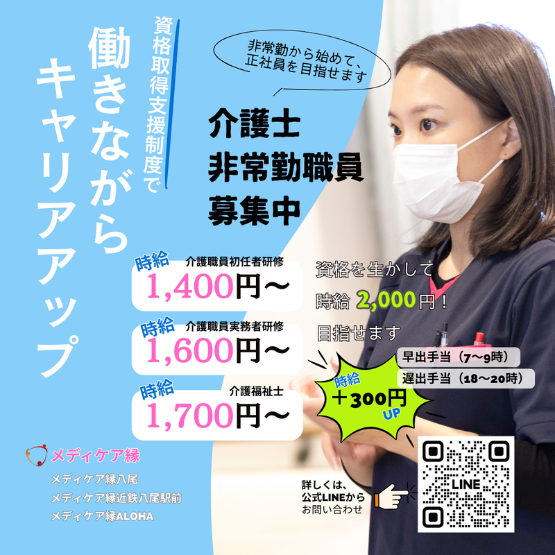 仕事内容 \\この求人のおすすめポイント!// ⭐看護師が24時間医療対応で安心サポート ⭐綺麗おしゃれなデザイナーズ施設 ⭐正社員へのキャリアアップ制度あり ⭐福利厚生が充実して働きやすい ⭐駅から徒歩5分の好アクセス ▼∴▼∴▼∴▼∴▼∴▼∴▼∴▼∴▼∴▼∴ ──────【仕事内容】────── ✅生活介護 ・食事の準備 ・部屋の掃除 ・身の回りの整理整頓 ✅身体介護 ・着替えの補助 ・食事の補助 ・入浴の補助 ・排泄の補助 など 住宅型有料老人ホーム(49室)の 夜勤専門の介護業務を担当します。 夜勤は3人体制で行っており、看護師も 常駐していますので、安心して お仕事をしていただける環境です◎ ▼∴▼∴▼∴▼∴▼∴▼∴▼∴▼∴▼∴▼∴ 【メディケア縁について】 八尾市にあるメディケア縁は、 キレイでおしゃれなデザイナーズ空間な 施設なのが魅力です✨ 24時間体制の看護師が医療対応しますので、 安心して介護業務に専念できる環境です◎ 入居者さんの状態に合わせた、幅広い医療ニーズ にも対応しています。 当施設のモットーは、 ✨Be You at Work✨ 自分らしく働ける環境作りを、 心掛けています☆ 働く方はもちろん、入居者様も 『自分らしく、私らしく』生活できるため、 快適で安心できる住サービスを ご用意しています◎ ぜひ私たちと一緒に働いてみませんか?