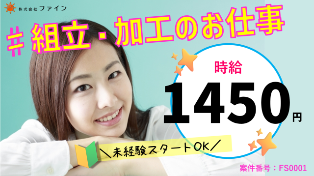 時間給1450円以上の高時給!工場内での組立・加工作業! 未経験者でも大歓迎です!エアコン完備 ◆案件番号FS0001◆ お電話で案件番号をお伝えください♪ ■未経験でも大丈夫■ 当社スタッフも未経験から スタートでお仕事してるので大丈夫!! 土日祝がお休みなのでプライベートも充実!! 高時給で男女問わず活躍中職場なので 気軽にお電話ください!! ファインで働く \ おすすめポイント / ◆社員登用の実績あり →長期で安心して働きたい方にピッタリ ◆うれしい週払い制度あり(規定あり) →貯蓄にまわして旅行の積み立てや 先に支払っておきたいお金など、いろいろご活用いただいてます ◆土日祝休み(会社カレンダーあり) ◆残業代はきっちり支給です!