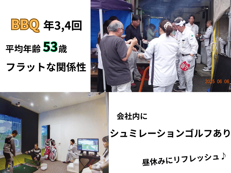 職場環境 10代から70代まで幅広く、世代ごとの垣根もない、明るく活気のある職場環境です! 健康増進のため、スポーツジムの会費(月1万円まで)補助や、会社内のシミュレーションゴルフ場の利用が可能です。昼休みにリフレッシュができる環境も整っております。 喫煙所:喫煙所あり(屋外)
