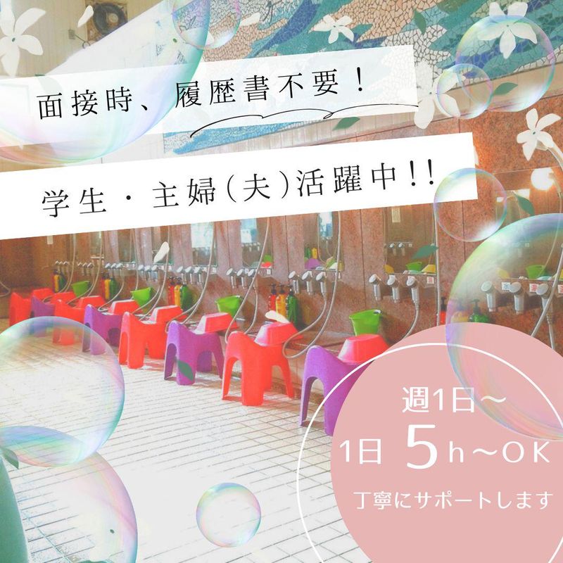 求めている人材 ✅未経験者歓迎 ✅ブランクOK ✅土日出勤できる方 ✅短期・長期どちらも歓迎! ✅20代~50代活躍中 <<こんな方にも✨>> ◇学校終わりに働きたい方 ◇家庭と両立して働きたい方 ◇人と接することが好きな方 ◇温泉・サウナ・スパなどが好きな方 ◇キレイ好きな方 ◇ホテルや旅館などで 客室スタッフの経験がある方 ◇モクモク作業が好きな方 ◇早朝&短時間のお仕事をお探しの方