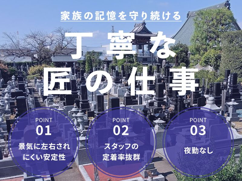仕事内容 <採用残りわずか!> x=x=x=x=x=x=x=x=x=x=x=x=x=x=x=x \MT免許があれば応募条件クリア/ 生活リズムを守れる安定した仕事! x=x=x=x=x=x=x=x=x=x=x=x=x=x=x=x この求人のポイント!! ●スタッフの定着率バツグンの環境 ●実務経験なくても大丈夫〇 ●夜勤なしで働きやすい ●ほぼ残業なし(月0~10時間程度) 【仕事内容】 群馬県高崎市の公営墓地や寺院墓地、 共同墓地、個人墓地を中心に、 墓地の施工をお任せします。 具体的には••• ・墓石、外柵組立 ・墓石、外柵の解体移動復元 ・コンクリート基礎工事(鉄筋、型枠) <入社後の流れ> 入社後はOJT形式の研修を通して 指導していきます。 分からないことがあれば、お気軽に ご質問・ご相談ください。